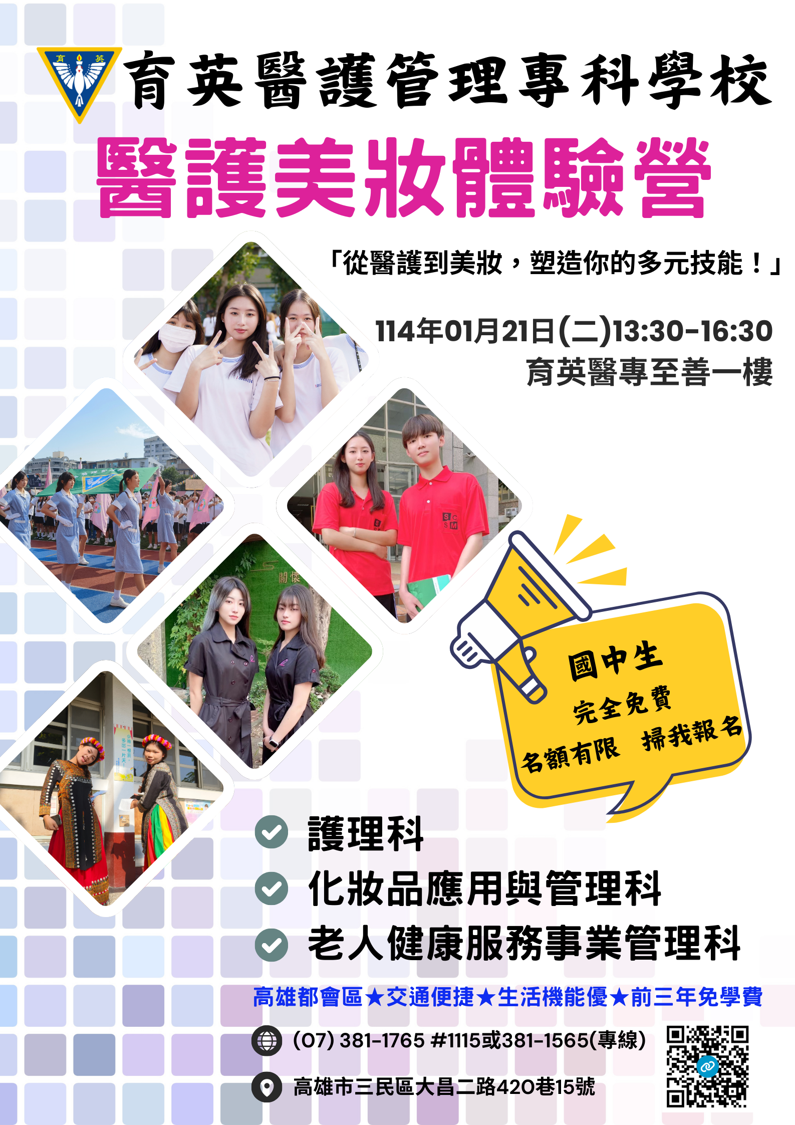 二、時間:114年1月21日(星期二)13:30-16:30。三、地點:育英醫護管理專科學校至善一樓。四、體驗科系:護理科、老人健康服務事業管理科、化妝品應用與管理科。五、活動報名網址 https://forms.gle/9GLTSNSgJNhb61Y29六、活動海報請見附件。